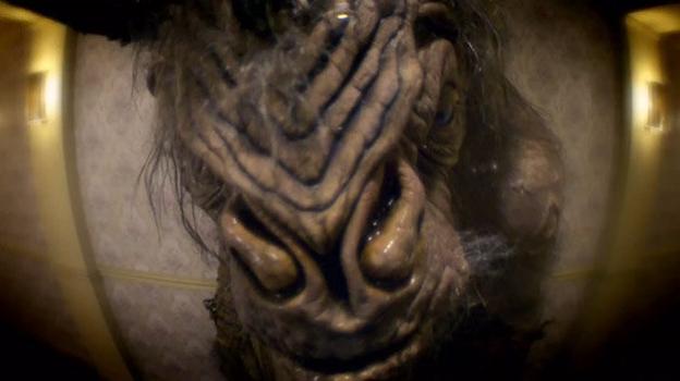 The group then begins wandering the hallways of the hotel, and begin encountering all sorts of strange occurrences. Howie, the blogger, eventually wanders off into a room, and is confronted by a gaggle of beautiful women, who mock him for his geekiness. Truly terrified, he begins muttering, “praise him.” The Doctor pulls him free, and they keep heading onward. Soon a loud grunting can be heard from down the hall, and the Doctor tells them all to hide. Rita and Joe head into one room, which contains Rita’s nightmare – her disapproving father. Becoming terrified, she, too, begins uttering “praise him.” Amy, Rory, the Doctor, Howie, and Gibbis, the alien, wander into another, which contains the infamous Weeping Angels. The Doctor soon determines that they are actually harmless illusions, and turns his attention to the peephole in the door, so as to see the monster as it passes by.