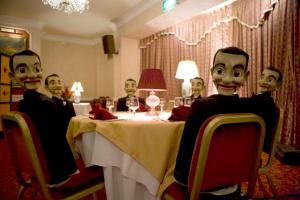 Trying to return to the TARDIS, they, of course, find it missing. The Doctor then asks if there are any other guests, and they tell him about Joe, who is, literally, “tied up right now.” Down in the dining room, Joe is tied to a chair when the Doctor and company walk in, surrounded by laughing ventriloquist’s dummies that are dressed just like him. Finding Joe to be completely cracked, the Doctor attempts to question him, allowing the madman to basically give the rules of the hotel: there is a room for everyone there, and once they find it, they will be “saved.” Joe goes on to ramble that nothing matters anymore; he has conquered his fears, and now he is waiting to be “saved by him.” Carrying the still-restrained Joe out and back to reception, the Doctor warns everyone not to enter any rooms they may be drawn to, and not to let anyone out of their sight.