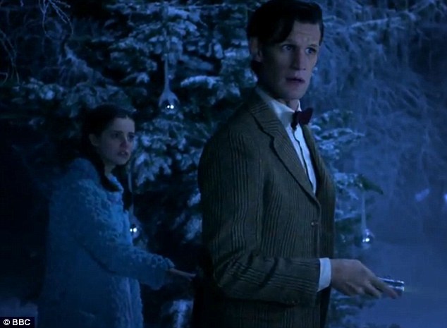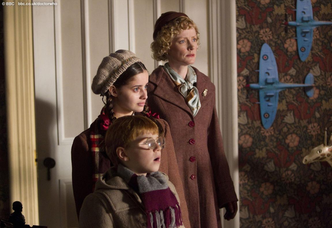 Three years later, the Second World War is underway, and Madge has just been informed that her loving husband Reg, a fighter pilot (Alexander Armstrong), has been reported as killed in action; his plane having gone missing while he was flying home for Christmas. Not wanting to ruin the holiday for her two children, teenage Lily (Holly Earl) and adolescent Cyril (Maurice Cole), she puts off telling them. Traveling to a relative’s home in the country to escape the Blitz, they find that the house’s former caretaker has been replaced by the Doctor, who Madge fails to recognize since he has long since removed the backwards helmet from his head. Despite the Doctor having converted the dreary old mansion into a house of wonders for the children, Madge remains gruff and moody, as she’s still grieving the loss of her husband and dreading the fact she’ll have to break the news to her children. During the following night, Lily and Cyril, unable to sleep, both go wandering around the house; Lily goes and discovers the Doctor tinkering with his “wardrobe,” the TARDIS, while Cyril, meanwhile, goes and investigates a large, mysterious gift box the Doctor placed under the tree. Climbing inside, Cyril gets lost in a world that seems filled with living Christmas trees. Discovering he’s gone, Lily and the Doctor go in after him, with Madge soon following after. It isn’t long before it’s clear that the magical world is in danger, and it’s up to the Doctor and the Arwells to try to save the planet’s trees before they are destroyed by an intergalactic slash and burn outfit (though in this case, they actually melt trees with acid rain).