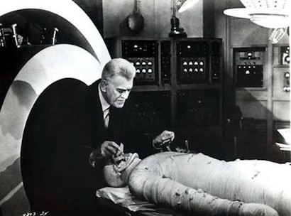 In the Hammer films, Baron Frankenstein wasn’t always trying to create a cadaverous ogre, as this image from “Frankenstein Created Woman” clearly demonstrates.
