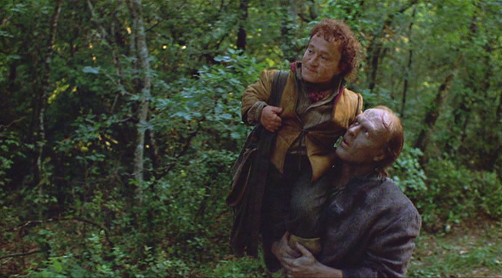 From “Frankenstein Unbound,” Raul Julia as Victor Frankenstein and Nick Brimble as a particularly deformed Monster.