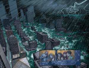 An incredibly disturbing image from the first few pages of Ultimatum, depicting New York City being destroyed by a tsunami.