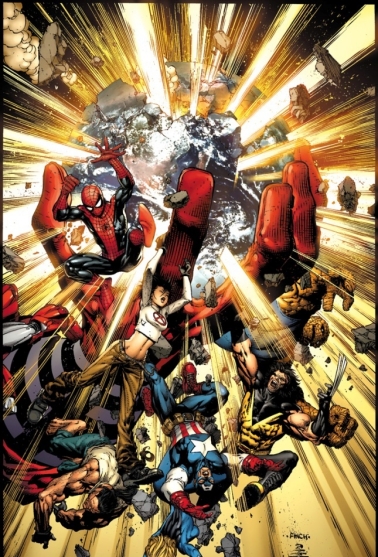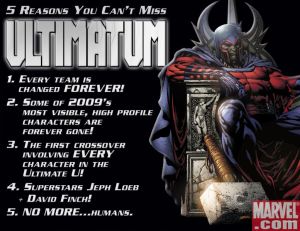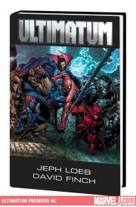 A limited series published over five issues between late 2008 and summer 2009, Ultimatum was presented as the major climactic culmination of Marvel’s “Ultimate” line of comics.  For those unfamiliar with the particularities of comic book publishing, the Ultimate imprint, which once included the continuous series Ultimate Spider-Man, Ultimate X-Men, Ultimate Fantastic Four and additional limited series such as the three Ultimates series (the Ultimates being the imprint’s version of the popular Avengers), was launched in 2000 and its continuity exists independently of the mainstream Marvel Universe.  Faced with a reading audience whose average age was skewing far older than ever before, and with both initial X-Men and Spider-man films being released within a few years of each other, Marvel crafted the Ultimate imprint as a way of drawing a new, younger generation into becoming comic book fans. Unencumbered by the mainstream universe’s very dense (and in some cases, borderline impregnable) continuities, the Ultimate imprint reintroduced many of the famous superheroes and supervillains of the Marvel universe and recast their origins in a more contemporary and relevant setting. Beginning with Spider-Man, and then continuing with the X-Men, Fantastic Four, and so on, the Ultimate line was, in essence, an isolated rebooting of the Marvel universe and its iconic characters presented for a new, younger, hipper generation.