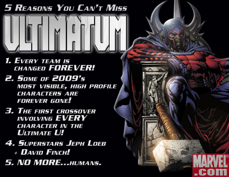 An advertisement listing the selling points for Ultimatum, with 2. implicitly advertising the morbid idea that many favorite superheroes were going to die, and 5. teasing the narrative's depiction of complete human genocide.